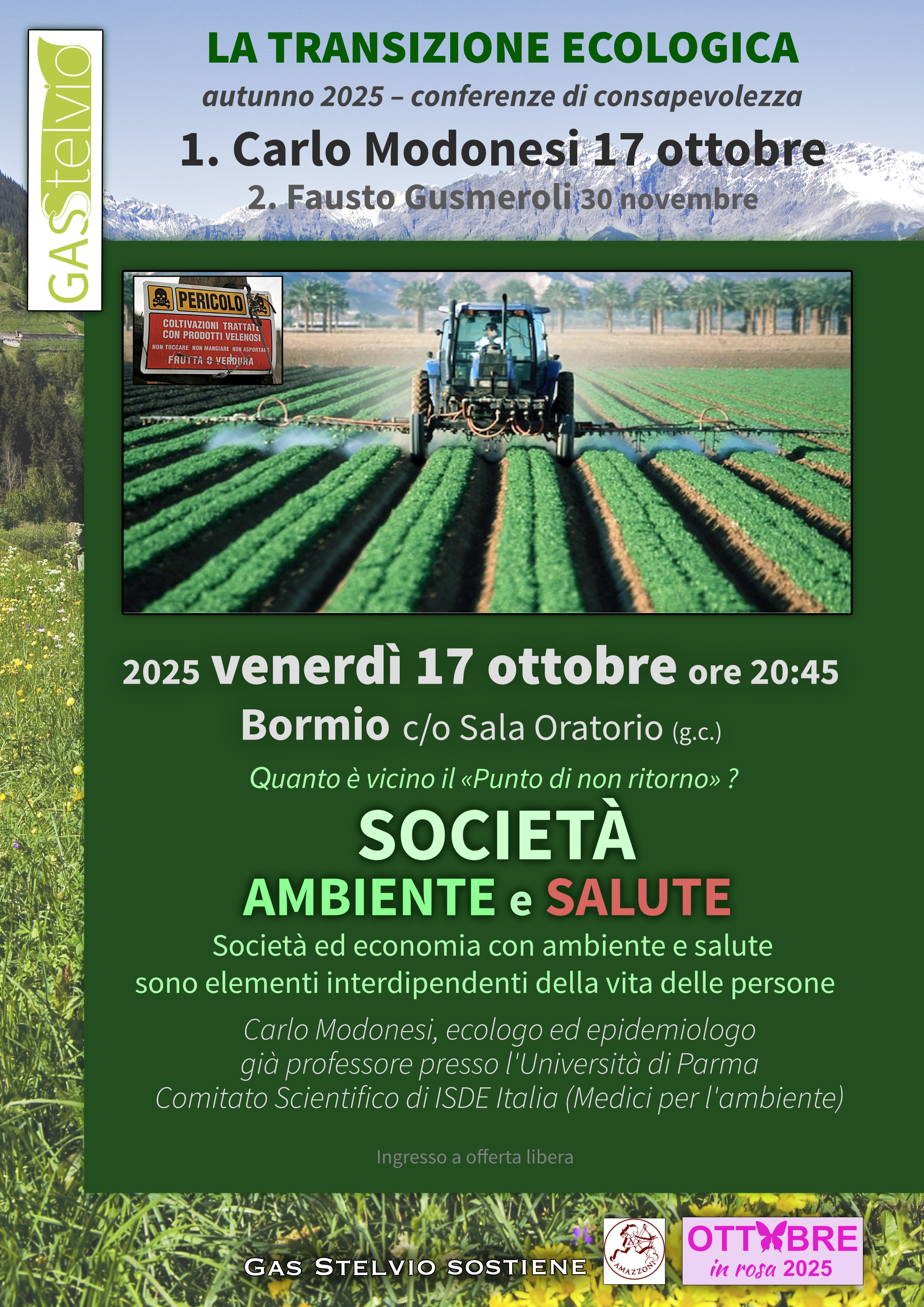 Il Gas Stelvio, Gruppo di Acquisto Solidale dell'Alta Valtellina, organizza per venerdì 17 ottobre 2025 un incontro sul tema della transizione ecologica, tenuto dal relatore dr. Carlo Modonesi, ecologo ed epidemiologo, già professore presso l'Università di Parma e membro del Comitato Scientifico di ISDE Italia (Medici per l'ambiente).