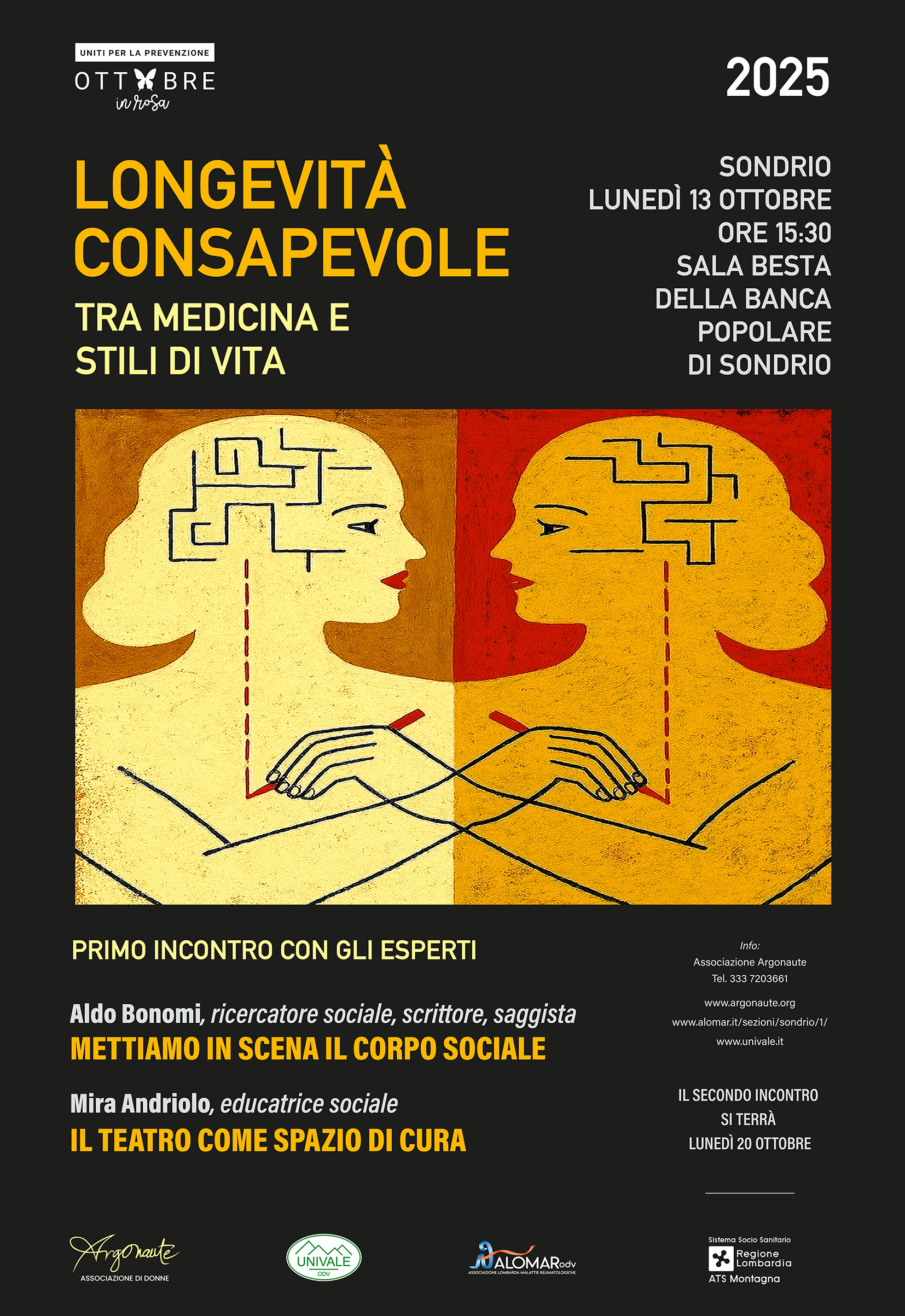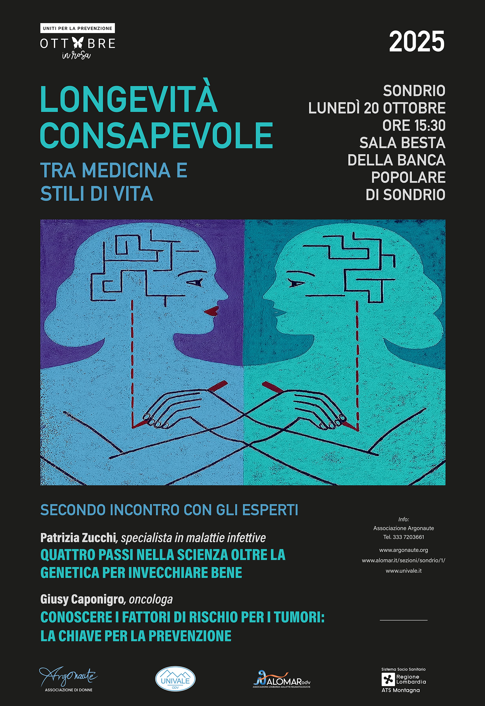 Da questa domanda nasce il ciclo di incontri «Longevità consapevole. Tra medicina e stili di vita», proposto dalle Associazioni Argonaute, Univale e Alomar OdV nell’ambito della manifestazione Ottobre in Rosa 2025, promossa da ATS della Montagna.