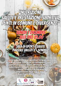 Sondrio, 26 novembre 2025 – La nutrizione protagonista dell’incontro, dedicato ai genitori, che si potrà seguire lunedì 1 dicembre 2025 a Sondrio nella sala conferenze di “Sport e salute” (piazzale Valgoi, 5). Un momento di confronto ideato e organizzato da “Auxilium Medical Zone”, progetto nato due anni fa con l’obiettivo di unire diverse figure professionali in campo medico-sanitario e ausiliario a quelle dello Staff Tecnico della PGS Auxilium Asd. Scopo principale che si è posta l’associazione, che da oltre 40 anni promuove la pratica sportiva sul territorio valtellinese, è quello di sviluppare un protocollo, un metodo condiviso per la miglior gestione della salute e della condizione fisica delle atlete.