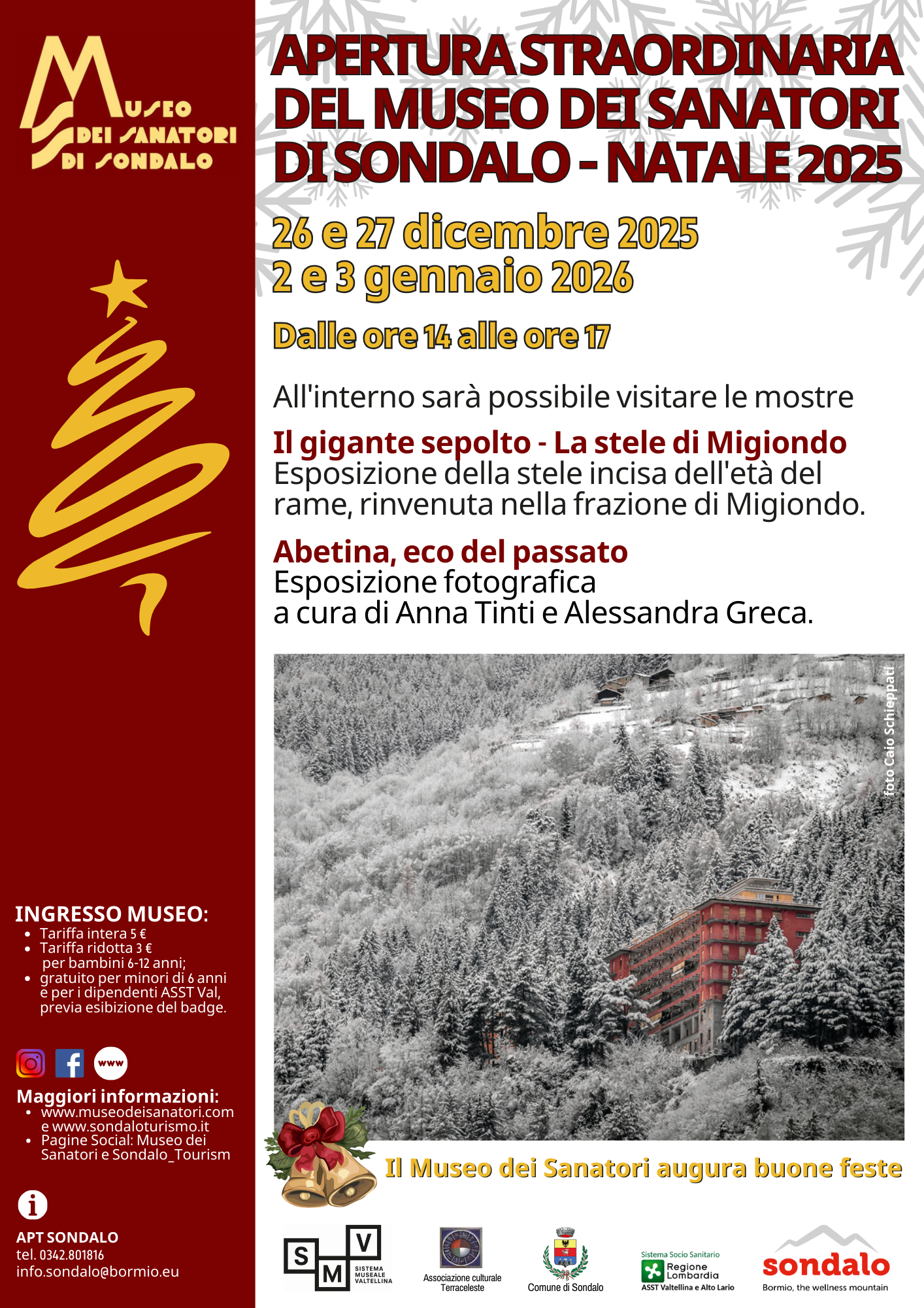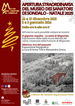 In occasione delle festività natalizie, il Museo dei Sanatori di Sondalo annuncia un’apertura straordinaria nelle giornate del 26 e 27 dicembre 2025 e del 2 e 3 gennaio 2026, con orario continuato dalle ore 14.00 alle ore 17.00.