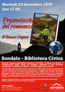 Martedì 23 dicembre 2025, alle ore 17.00, presso la Biblioteca Civica di Sondalo, si terrà la presentazione del romanzo “Valtellina in giallo” di Renato Ciaponi.
