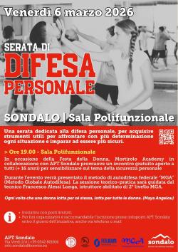 Presso la sala Polifunzionale, venerdì 6 marzo 2026 alle ore 19.00, la Mortirolo Academy, in collaborazione con APT Sondalo, promuove una serata gratuita di difesa personale aperta a tutti (età minima 16 anni), per sensibilizzare sul tema della sicurezza personale e fornire strumenti concreti per affrontare ogni situazione con maggiore determinazione e sicurezza.