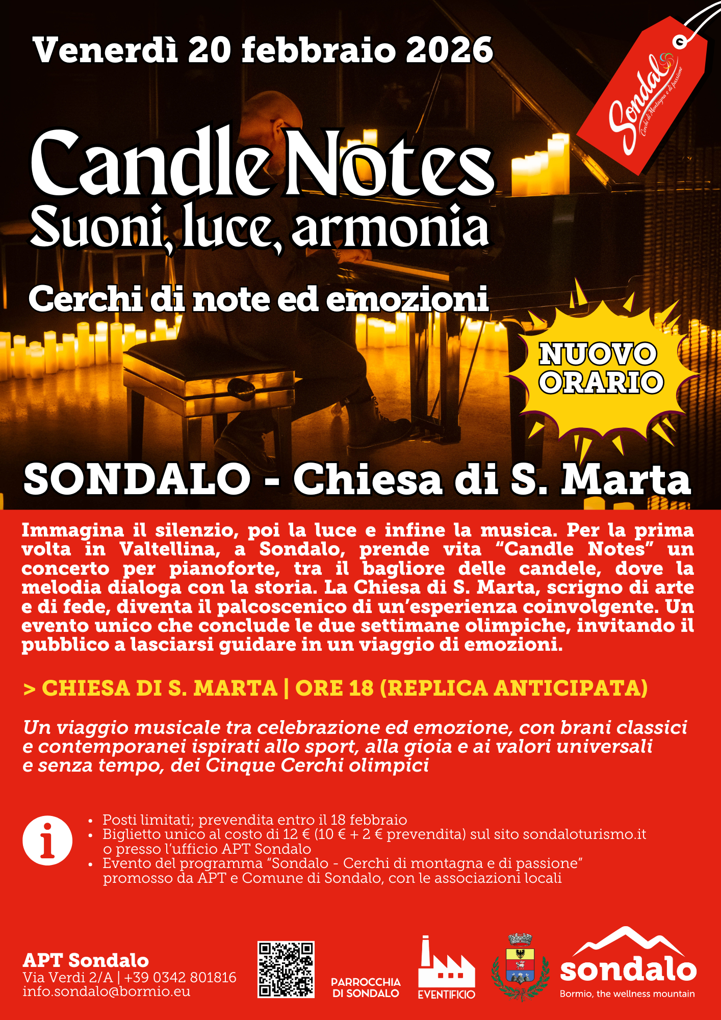 Immagina il silenzio, poi la luce e infine la musica. Tra il caldo bagliore delle candele, le note del pianoforte prenderanno vita, dialogando con lo spazio e la storia. La Chiesa di Santa Marta diventerà così il palcoscenico di un viaggio emozionale, capace di unire raccoglimento e meraviglia, celebrando simbolicamente la fine delle Olimpiadi in corso nell’Alta Valtellina. I brani, classici e contemporanei, ispirati allo sport, alla gioia e ai valori universali dei Cinque Cerchi olimpici, accompagneranno il pubblico in un percorso di emozioni senza tempo.