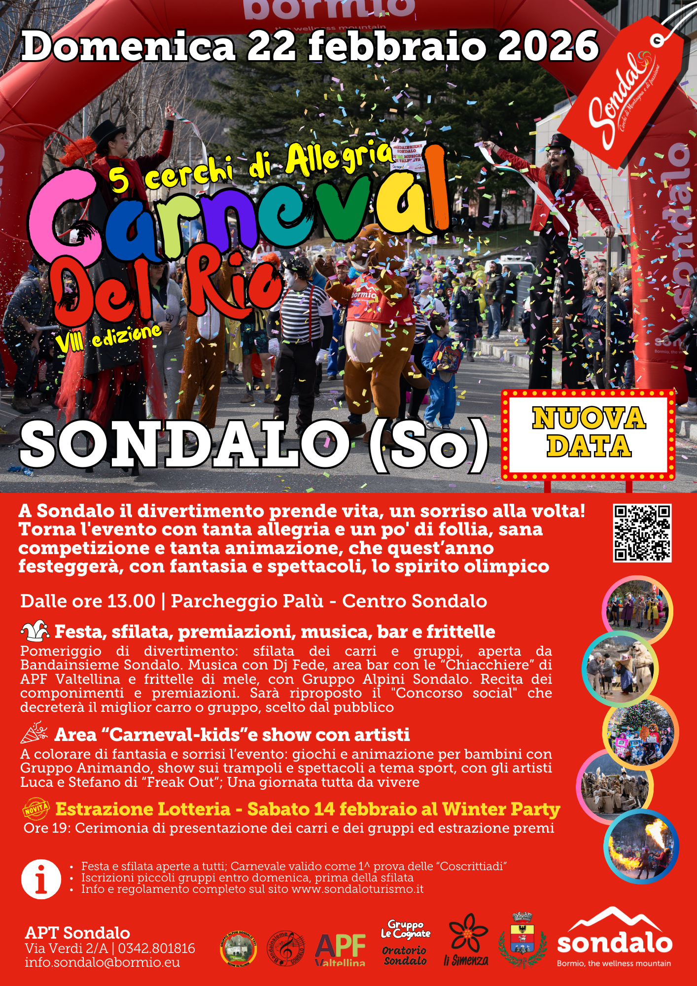 Il Carneval del Rio è promosso da APT Sondalo, in collaborazione con l’Associazione Giovani Sondalo “Li Simenza”, Oratorio Sondalo e le tante realtà locali, a dimostrazione di quanto questa festa sia il frutto dell’impegno e del cuore di un’intera comunità.