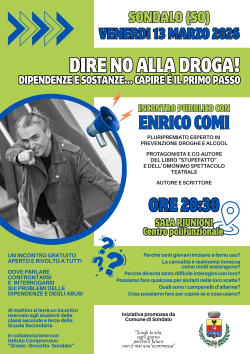 Il Comune di Sondalo promuove un nuovo incontro pubblico dedicato a un tema che riguarda tutta la comunità: “DIRE NO ALLA DROGA! – Dipendenze e sostanze… Capire è il primo passo”.
