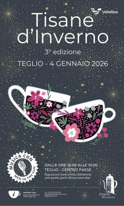 Teglio (SO), 30 dicembre 2025 – Torna a Teglio uno degli appuntamenti più attesi della stagione fredda: “Tisane d’Inverno”, giunto alla terza edizione, in programma domenica 4 gennaio 2026, dalle ore 15.00 alle 19.00, nel centro del paese.