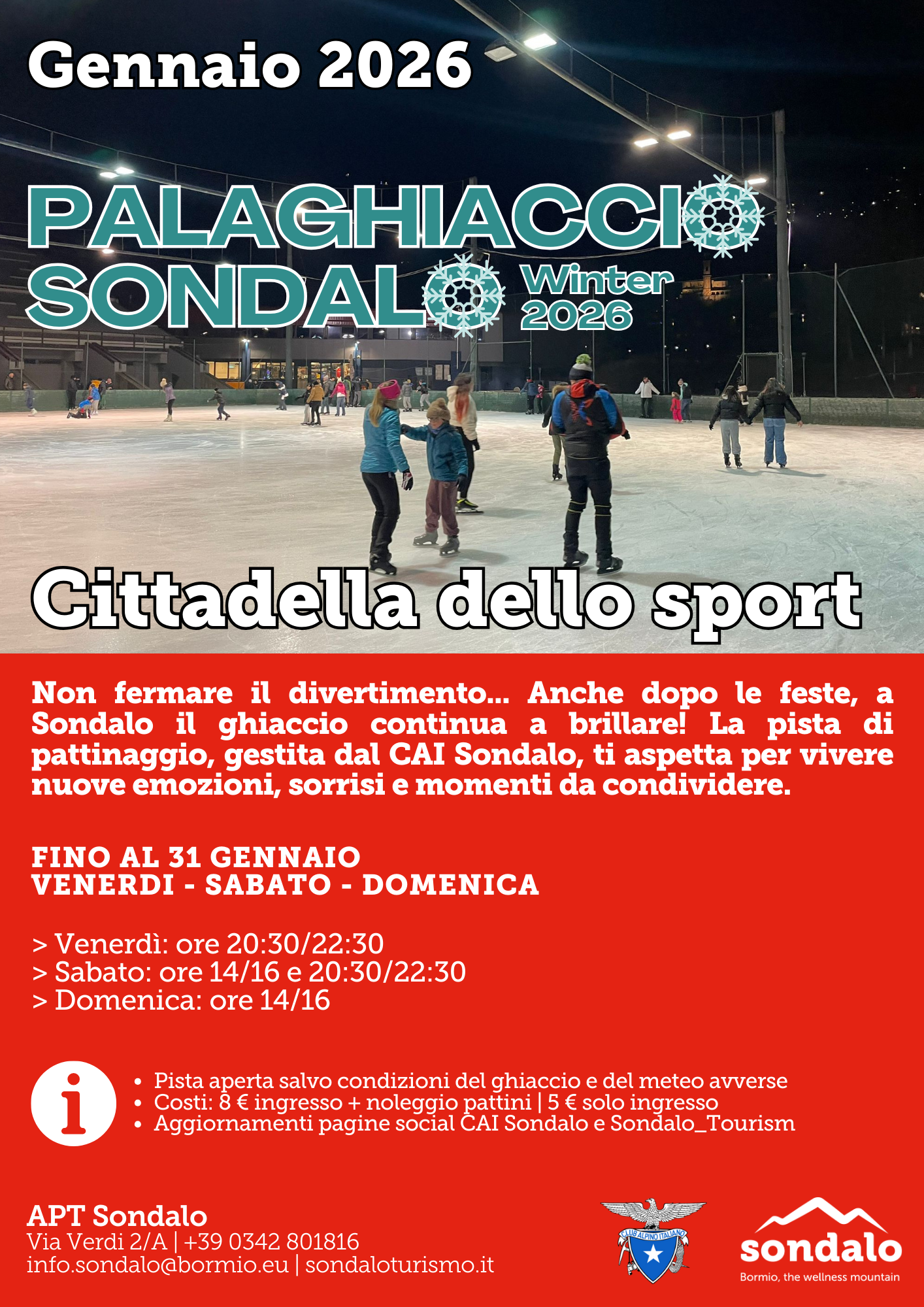 Che sia una serata tra amici, un pomeriggio in famiglia o le prime scivolate, la pista di pattinaggio, gestita dal CAI Sondalo, rappresenta il luogo ideale per vivere l’inverno in modo attivo e spensierato.