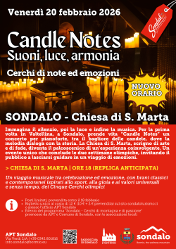 Cerchi di note ed emozioni: venerdì 20 febbraio Sondalo si prepara a vivere una serata davvero speciale. Per la prima volta in Valtellina arriva “Candle Notes”, il concerto per pianoforte a lume di candela che sta conquistando il pubblico con la sua atmosfera intima e suggestiva.