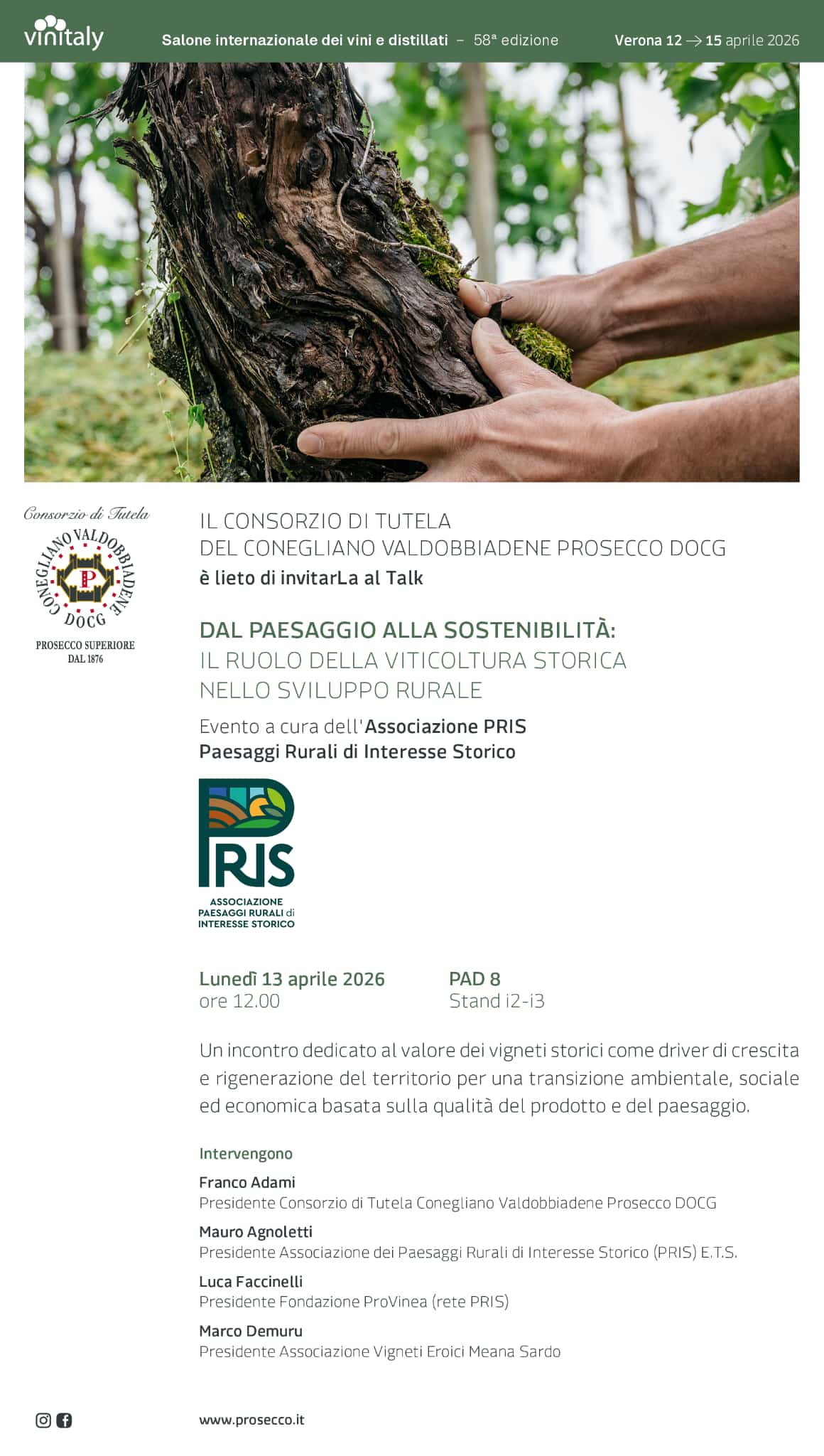 Sondrio, 23 aprile 2026 - Fondazione Provinea protagonista con la Valtellina a Vinitaly 2026 durante il workshop organizzato dal Consorzio di Tutela del Prosecco di Conegliano Valdobbiadene e intitolato “Dal paesaggio alla sostenibilità: il ruolo della viticoltura storica nello sviluppo rurale”.