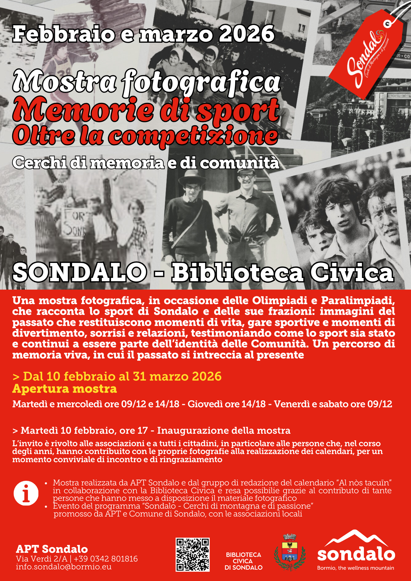 L’esposizione racconta la storia sportiva di Sondalo e delle sue frazioni attraverso immagini del passato che restituiscono momenti di vita quotidiana, gare sportive, attimi di svago e divertimento. Fotografie che parlano di sorrisi, relazioni e partecipazione, testimoniando come lo sport sia stato, e continui a essere, un forte elemento sociale e aggregativo per le comunità locali. Il percorso espositivo si configura come una memoria viva, in cui il passato dialoga con il presente, valorizzando non solo la dimensione agonistica, ma soprattutto quella umana e collettiva dello sport.
